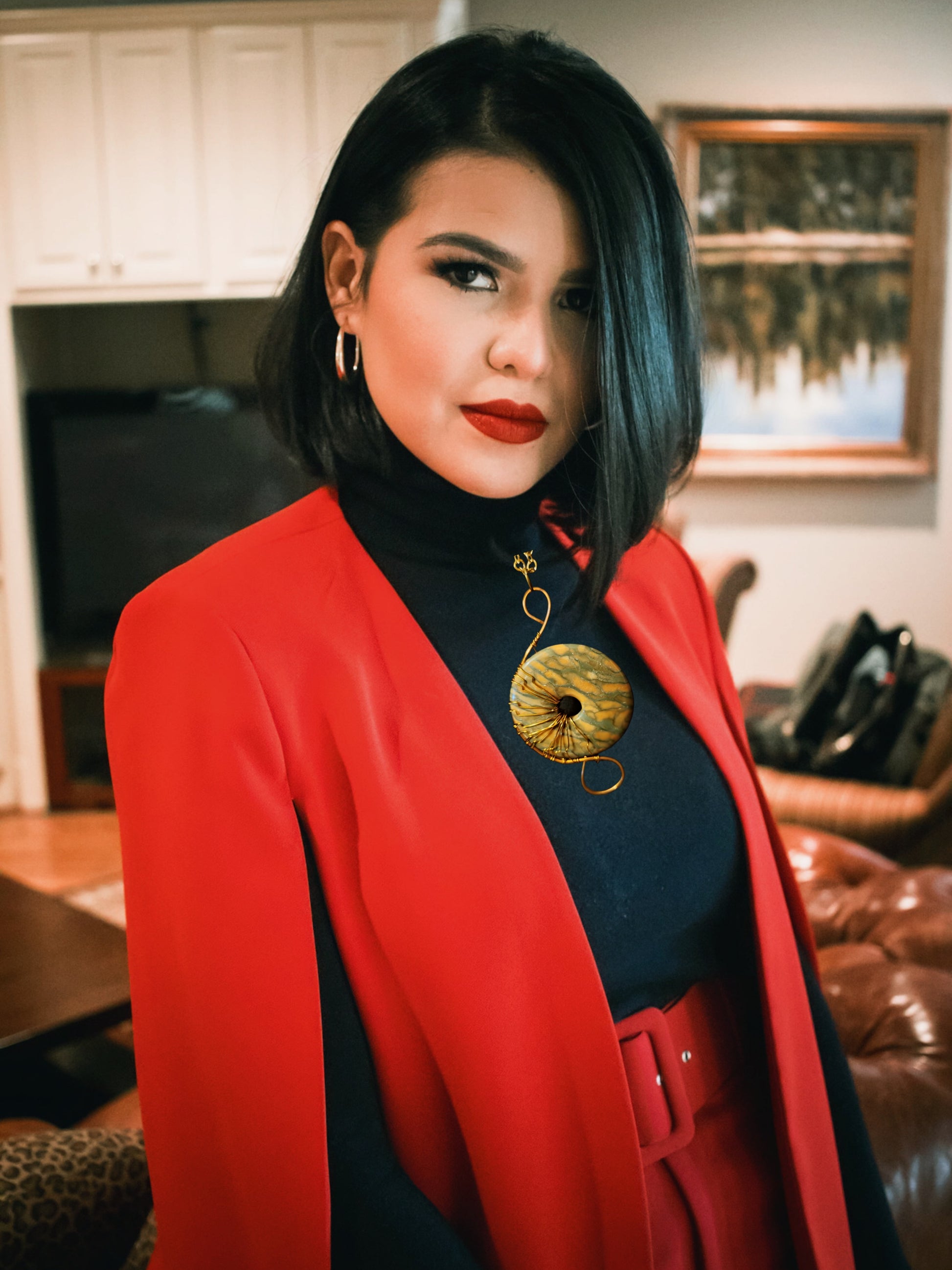 Very unique canyon marble donut shaped bead wrapped in copper wire. This pendant is on a 24" gold-toned chain. This is definitely a statement piece.