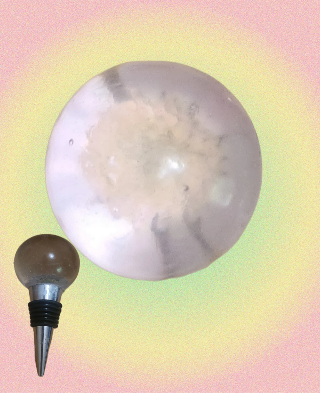 This bottle stopper is a real show stopper. Look closely, you will see a pink and yellow flower at the bottle of the sphere, but from the side, the bottle stopper looks like a clear sphere.