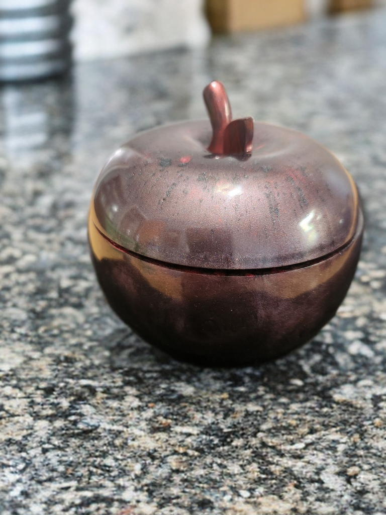 This "poison" apple trinket box will make a great addition to your home. It is reddish purple and made of resin.
